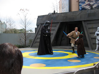 This experience was a big effort and worth every minute. We noticed the area right when we got in the park. Owen was all for it. There was this line, but we weren't sure what that was for. So we just stood there and watched for about 20 minutes. Finally, we figured out that we would have to stand in line for our chance for Jedi training. So Daddy and Owen agreed to stand in line while Allie and Mommy went to see if there was something for the girls to do. We saw a show about Aerial was going to be showing about 45 minutes later. So we got our "Fast Pass" tickets for the show and went back to see how the boys were. We get back and find out that they weren't picked for the 11:45 show. So I take both kids to the "Indiana Jones" show while Daddy stays in line hoping for the next show. Half way through the show, Jake texts me that Owen in on the list but has to be there in 10 minutes! So we leave the show and hall butt to get him there. I drop him off with Jake and they tell me he is in for the 12:30 show. So Allie and I run to catch the Aerial show and just make it back in time to watch Owen do his training. Owen got to fight Darth Vader, as Jake put it, "So worth the 2 hour wait in line!" I sensed he wished it could have been him. :)