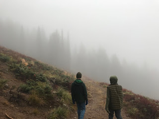 We've started doing family hikes about 2-3 times a month. They are to help us get acclimated to the terrain and altitude for when we go skiing this winter. Today we went to Mt. Spokane, which we have done a couple of times before. However, this time it was a little different. The Summit Road we usually drive up and park at was closed for the season. So we parked about half way down and found a new trail to hike. The weather was perfect! Very cloudy and drizzly, with fog actually rolling down into the trees as we hiked. We even came upon a ski lift and a sign that marked it as a Black Diamond. Very fun and fitting for the Sunday before Halloween!